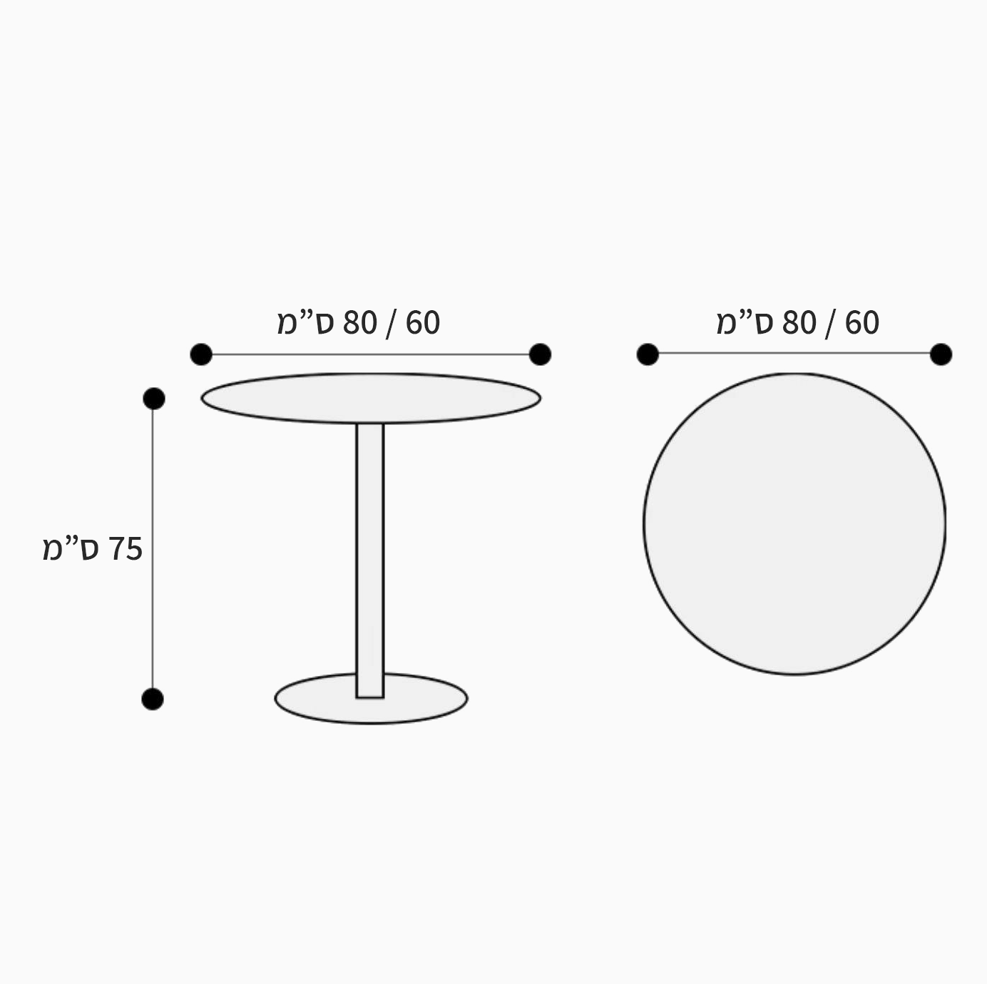 מידה : קוטר המשטח 60 ס"מ או 80 ס"מ, גובה 75 ס"מ