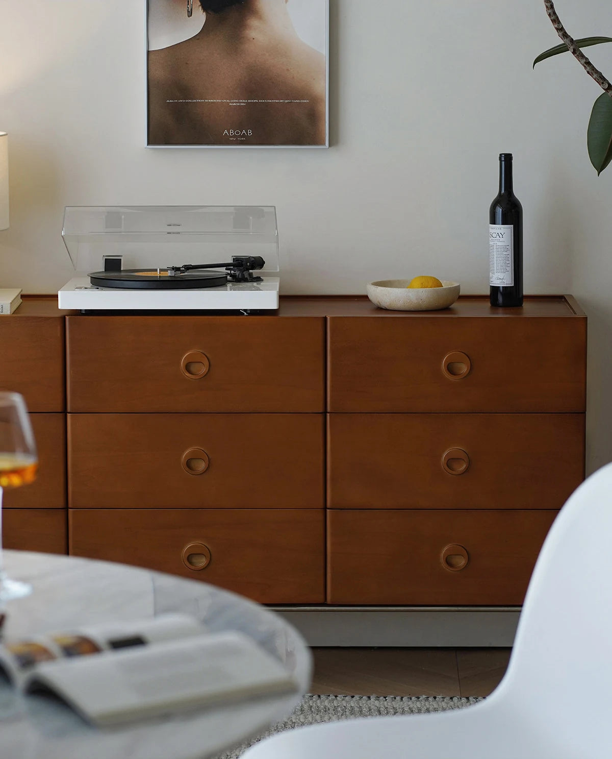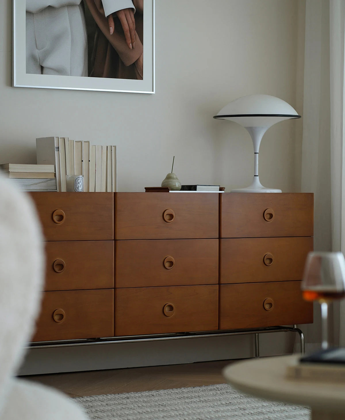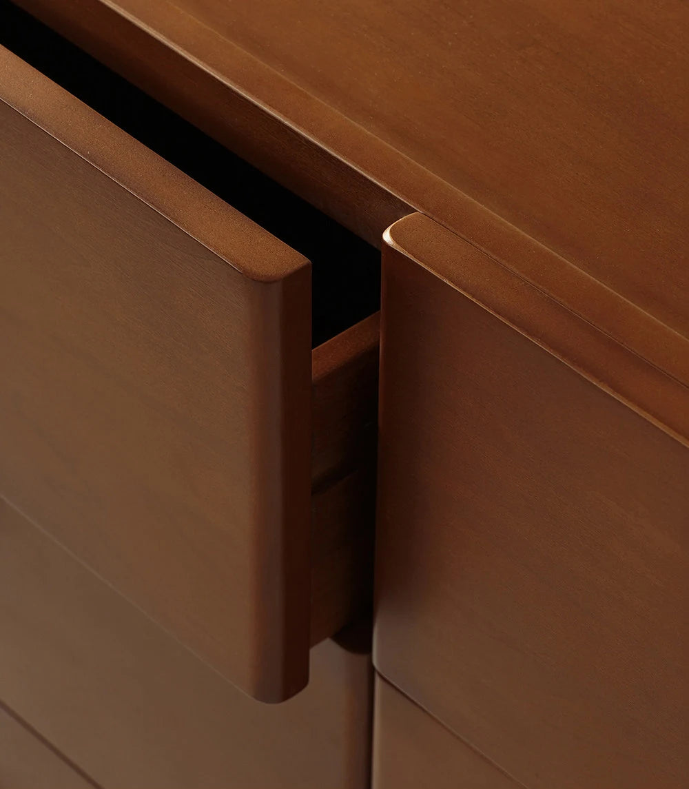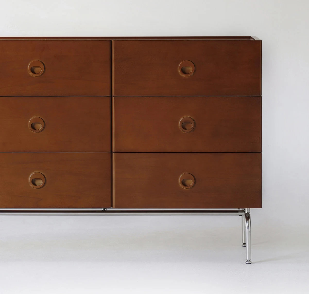 ידיות שקועות בעיצוב עגול - משולבות בחזית המגירה. מסילות עם מנגנון סגירה שקטה ואיטית.