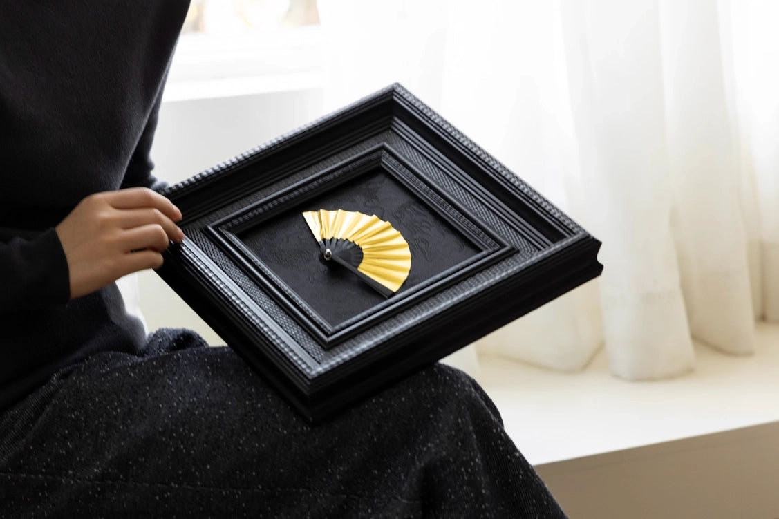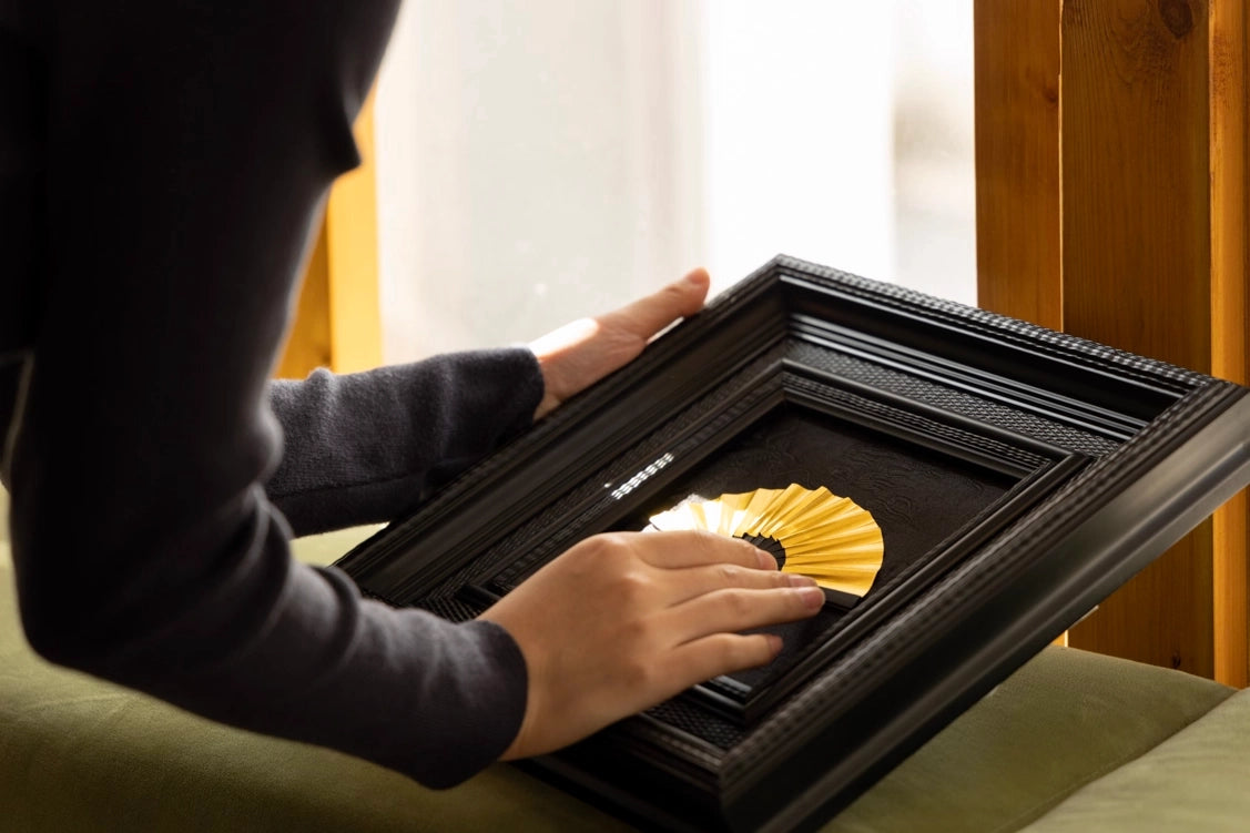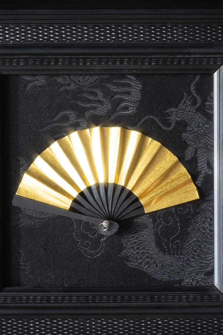 מסגור כפול ברמת פריט אספנות, ללא זכוכית, כך שניתן לחוש במשטח הרקמה וגם במניפה עצמה.