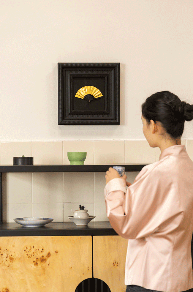 האלמנט המרכזי: מניפה מתקפלת בגוון זהב, בעלת 12 עלי מניפה – סמל לשנים עשר החודשים ולברכה של שלמות ושגשוג.
