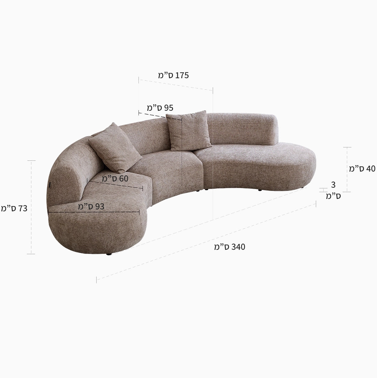 גובה 73 ס"מ, עומק 175 ס"מ, אורך 340 ס"מ