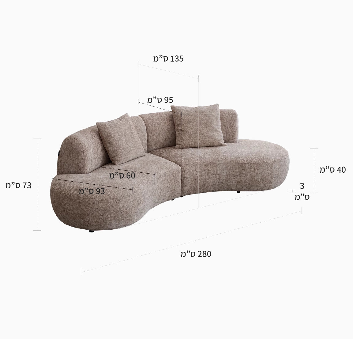 גובה 73 ס"מ, עומק 135 ס"מ, אורך 280 ס"מ